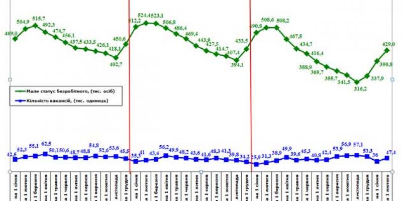 Станом на 1 лютого 2017 року порівняно з відповідною датою минулого року кількість безробітних становила 429 тис. та зменшилася на 16%. Кількість осіб, які отримують допомогу по безробіттю, скоротилася на 15% (до 351 тис. осіб).