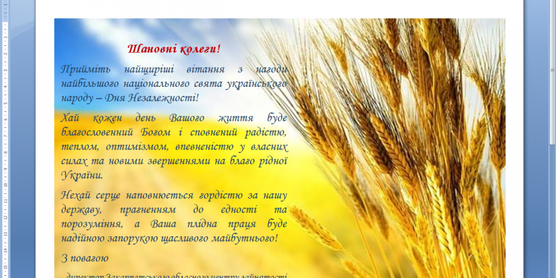 Вітання директора Закарпатського обласного центру зайнятості Юрія Фущича з Днем Незалежності України